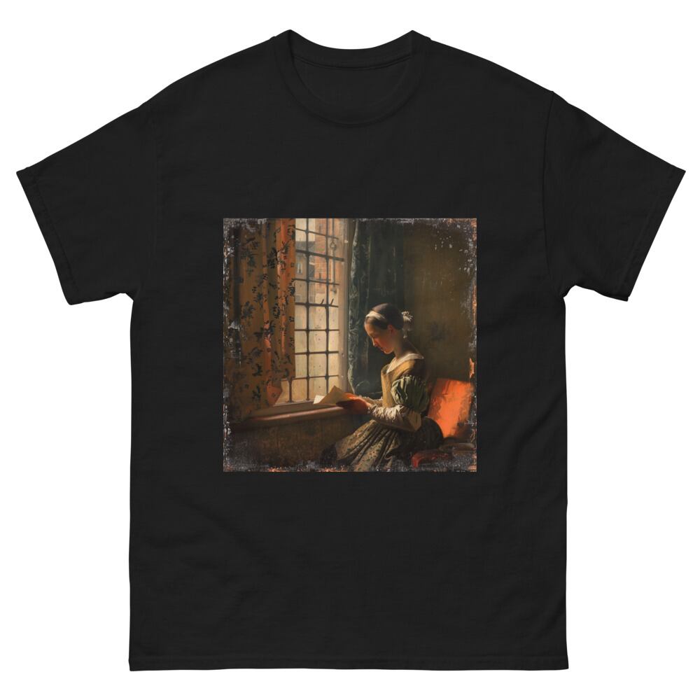 This T-shirt features Johannes Vermeer's "Woman Reading a Letter in a Window" motif. With its beautiful colors and delicate depiction, this piece is sure to add beauty to any outfit you wear. This piece is recommended for those who want to incorporate a little art into their daily lives.