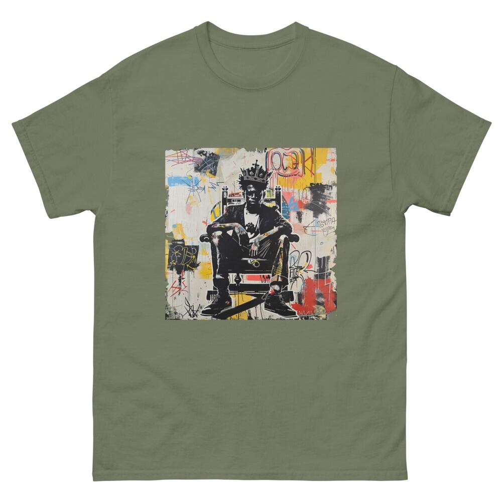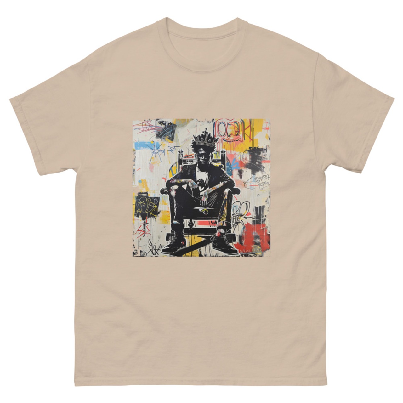 バスキアの作品を模したTシャツです。コットン100%のメンズ クラシックTシャツで一段上のおしゃれな装いを。しっくりくるシルエット、縁部分のシャープな輪郭を保ち、そして重ね着に最適です。今まさに流行のアイテムです。