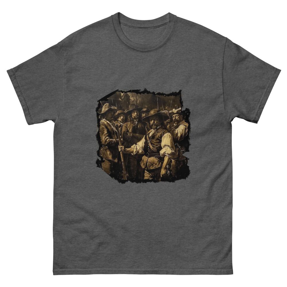 レンブラント【夜警】Tシャツは、オランダの巨匠レンブラントの名作「夜警」をモチーフにしたアートTシャツです。迫力ある立体感と緻密な描写がそのまま再現されており、まるで絵画の中に身を置いているような感覚を楽しめます。
